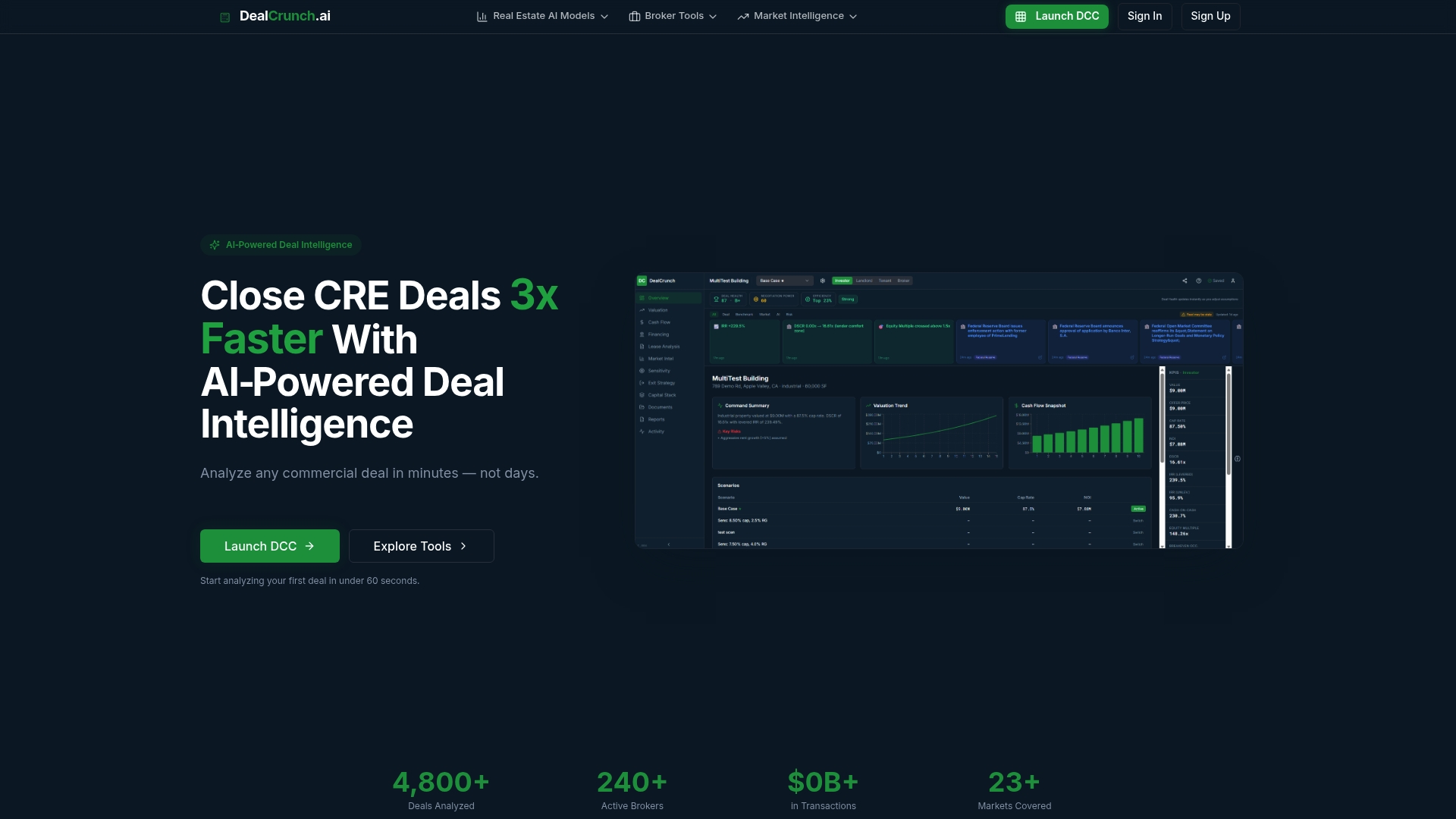 DealCrunch.ai solves these challenges by providing an all-in-one AI-powered platform designed to replace fragmented spreadsheets and manual calculations. From 10-year proforma modeling and cap rate analysis to scenario comparison engines and deal health scoring, everything seamlessly connects so you can verify your data, model dynamic outcomes, and validate investment KPIs with ease. Save time, reduce risk, and present your deals more professionally with advanced tools that keep pace with today’s fast-moving CRE markets.